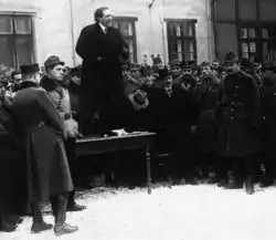On 20 March, Károlyi announced that the government of Prime Minister Dénes Berinkey would resign. The presentation of the Vix Note proved fatal to the government, which was by then devoid of significant support.[28] Károlyi and Berinkey had been placed in an untenable situation when they received a note from Paris ordering Hungarian troops to further withdraw their lines. It was widely assumed that the new military lines would be the postwar boundaries. Károlyi and Berinkey concluded that they were not in a position to reject the note although they believed that accepting it would endanger Hungary's territorial integrity. On 21 March, Károlyi informed the Council of Ministers that only Social Democrats could form a new government, as they were the party with the highest public support in the largest cities and especially in Budapest. To form a governing coalition, the Social Democrats started secret negotiations with the Communist leaders, who were still imprisoned, and decided to merge their two parties under the name of the Hungarian Socialist Party.[29] President Károlyi, who was an outspoken anticommunist, was not informed about the merger. Thus, he swore in what he believed to be a Social Democratic government, only to find himself faced with one dominated by Communists. Károlyi resigned on 21 March. Béla Kun and his fellow communists were released from the Margit Ring prison on the night of 20 March.[30] The liberal president Károlyi was arrested by the new Communist government on the first day; in July, he managed to make his escape and flee to Paris.[31]