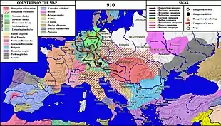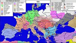 The Hungarian invasions of Europe (Hungarian: kalandozások, German: Ungarneinfälle) took place in the 9th and 10th centuries, the period of transition in the history of Europe in the Early Middle Ages, when the territory of the former Carolingian Empire was threatened by invasion from multiple hostile forces, the Magyars (Hungarians) from the east, the Viking expansion from the north, and the Arabs from the south.[1][2]