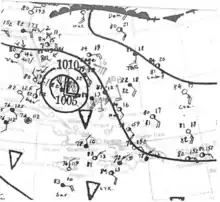 The season was continuously active, with six storms forming during the month of August alone.[11] At the time, many storms received the distinction of being the earliest nth storm to form, such as the earliest fifth tropical storm to form in a season. Most of the records were broken in later years.[12] During the season, the U.S. Weather Bureau issued storm and hurricane warnings for eight storms, including coastal portions of Texas, as well as from Florida to Massachusetts, forcing the evacuations of thousands of people. The deadliest storm of the season was a hurricane that struck Tampico, Mexico, killing over 184 residents. The costliest hurricane was the Chesapeake–Potomac hurricane, which caused $27 million in damage from North Carolina to New Jersey.[nb 4] The hurricane produced rainfall that resulted in severe crop damage in Maryland.[10]
