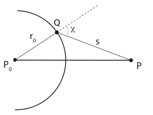 For an aperture illumination consisting of a single expanding spherical wave, if the radius of the curvature of the wave is sufficiently large, Kirchhoff gave the following expression for K(χ):[6]