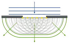 The Huygens–Fresnel principle (named after Dutch physicist Christiaan Huygens and French physicist Augustin-Jean Fresnel) states that every point on a wavefront is itself the source of spherical wavelets, and the secondary wavelets emanating from different points mutually interfere.[1] The sum of these spherical wavelets forms a new wavefront. As such, the Huygens-Fresnel principle is a method of analysis applied to problems of luminous wave propagation both in the far-field limit and in near-field diffraction as well as reflection.