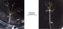 Hydras undergo morphallaxis (tissue regeneration) when injured or severed. Typically, Hydras reproduce by just budding off a whole new individual; the bud occurs around two-thirds of the way down the body axis. When a Hydra is cut in half, each half regenerates and forms into a small Hydra; the "head" regenerates a "foot" and the "foot" regenerates a "head". This regeneration occurs without cell division. If the Hydra is sliced into many segments, the middle slices form both a "head" and a "foot".[6] The polarity of the regeneration is explained by two pairs of positional value gradients. There is both a head and foot activation and inhibition gradient. The head activation and inhibition works in an opposite direction of the pair of foot gradients.[22] The evidence for these gradients was shown in the early 1900s with grafting experiments. The inhibitors for both gradients have shown to be important to block the bud formation. The location where the bud forms is where the gradients are low for both the head and foot.[6]
