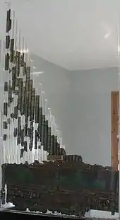 Characteristics of the hydraulis have been inferred from mosaics, paintings, literary references, and partial remains. In 1931, the remains of a hydraulis were discovered in Hungary, with an inscription dating it to 228 CE. The leather and wood of the instrument had decomposed, but the surviving metal parts made it possible to reconstruct a working replica now in the Aquincum Museum in Budapest.[4][5] The exact mechanism of wind production is debated, and almost nothing is known about the music played on the hydraulis, but the tone of the pipes can be studied.[6][7] The Talmud mentions the instrument as not appropriate for the Jerusalem Temple.[8][9]