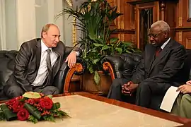 On 1 November 2015, former World Athletics president Lamine Diack was arrested in France and is under investigation on suspicion of corruption and money laundering.[57][58] Diack allegedly accepted "$1.2 million from the Russian athletics federation to cover up the positive doping tests of at least six Russian athletes in 2011."[57] The IOC provisionally suspended Diack,[59] and he resigned his position as an IOC Honorary Member.[60] In 2016, the World Anti-Doping Agency reported that with his influence,[61] Diack was able to install two of his sons and a friend into positions that exerted influence over the IAAF.[61] The report says that Lamine Diack "was responsible for organizing and enabling the conspiracy and corruption that took place in the IAAF."[61] In 2018, Diack was handed an additional charge of "breach of trust" by French prosecutors.[62] On 18 June 2020, the trial of Diack and five other people, including his son, concluded. Diack was sentenced to jail for four years, two of them suspended.[63]