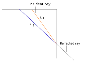 Interpretation of Ibn Sahl's construction. If the ratio of lengths is kept equal to then the rays satisfy the law of sines, or Snell's law. The inner hypotenuse of the right-angled triangle shows the path of an incident ray and the outer hypotenuse shows an extension of the path of the refracted ray if the incident ray met a change of medium whose face is vertical at the point where the two hypotenuses intersect. The ratio of the length of the smaller hypotenuse to the larger is the ratio of the refractive indices of the media.[1]