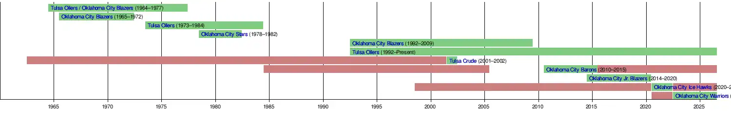 Oklahoma City WarriorsOklahoma City Ice HawksOklahoma City Ice HawksOklahoma City BaronsTulsa CrudeTulsa OilersOklahoma City Blazers (1992–2009)Oklahoma City Stars (ice hockey)Oklahoma City Blazers (1965–1977)