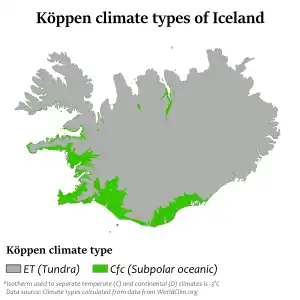 Located on a rift between tectonic plates, Iceland's geologic activity includes geysers and frequent volcanic eruptions.[13][14] The interior consists of a volcanic plateau characterised by sand and lava fields, mountains, and glaciers, and many glacial rivers flow to the sea through the lowlands. Iceland is warmed by the Gulf Stream and has a temperate climate, despite a latitude just south of the Arctic Circle. Its high latitude and marine influence keep summers chilly, and most of its islands have a polar climate.