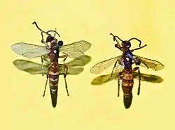Ichneumon sarcitorius can reach a length of 10–15 millimetres (0.39–0.59 in) in the males, of 10–13 millimetres (0.39–0.51 in) in the females.[3] These wasps show an evident sexual dimorphism. The males have a wasp like appearance with a black and yellow banded abdomen, while the females have a black abdomen with two orange bands and a white tip.[4]