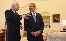 American President George W. Bush (right) and Senator John McCain (left), pictured meeting at the White House in March 2008, have both been known as prominent neoconservatives.