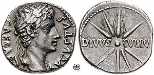 A denarius minted circa 18 BC. Obverse: CAESAR AVGVSTVS; Reverse: DIVVS IVLIV(S), with comet of eight rays, tail upward
