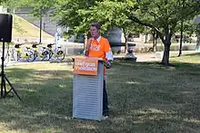 The proposal was supported by all major Democrats at the city and state level. Aside from the mayor and Democratic city councilors, the proposal was supported by Marion County Prosecutor Ryan Mears, Indianapolis Metropolitan Police Department Chief Randall Taylor, Marion County Sheriff Kerry Forrestal, and Corporation Counsel Matt Giffin.[23] Giffin, the city/county lawyer who would be responsible for invoking the law if it becomes enforceable, defended its constitutionality by describing it as a trigger law to go into effect if the state legislature or the courts allowed it.[23] At each hearing, a large contingent of Moms Demand Action Indianapolis activists in red shirts sat in the gallery and spoke in support of the proposal.[27]