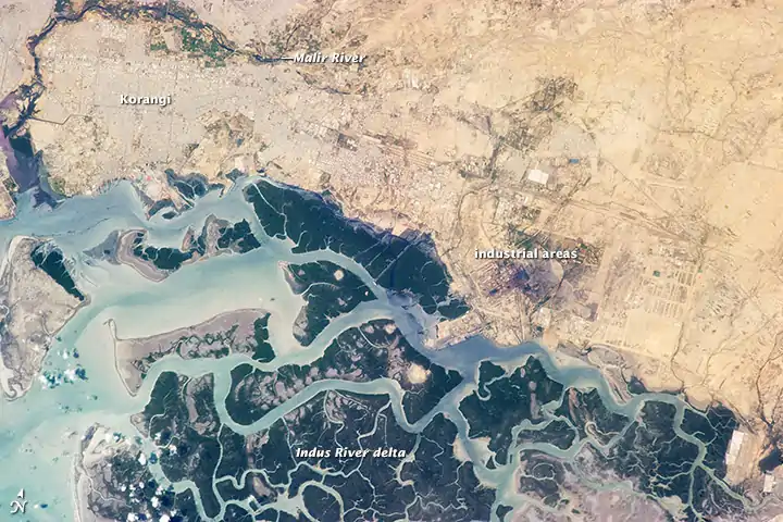 Karachi (centred in the image) is located along the western edge of the Indus River Delta (bottom-right).