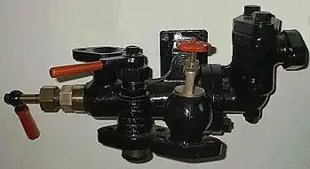 The steam injector is a common device used for delivering water to steam boilers, especially in steam locomotives. It is a typical application of the injector principle used to deliver cold water to a boiler against its own pressure, using its own live or exhaust steam, replacing any mechanical pump. When first developed, its operation was intriguing because it seemed paradoxical, almost like perpetual motion, but it was later explained using thermodynamics.[1] Other types of injector may use other pressurised motive fluids such as air.