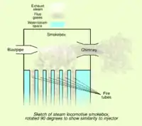 An empirical application of the principle was in widespread use on steam locomotives before its formal development as the injector, in the form of the arrangement of the blastpipe and chimney in the locomotive smokebox. The sketch on the right shows a cross section through a smokebox, rotated 90 degrees; it can be seen that the same components are present, albeit differently named, as in the generic diagram of an injector at the top of the article. Exhaust steam from the cylinders is directed through a nozzle on the end of the blastpipe, to reduce pressure inside the smokebox by entraining the flue gases from the boiler which are then ejected via the chimney. The effect is to increase the draught on the fire to a degree proportional to the rate of steam consumption, so that as more steam is used, more heat is generated from the fire and steam production is also increased. The effect was first noted by Richard Trevithick and subsequently developed empirically by the early locomotive engineers; Stephenson's Rocket made use of it, and this constitutes much of the reason for its notably improved performance in comparison with contemporary machines.