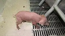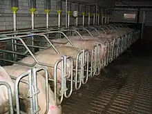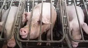 The pigs begin life in a farrowing or gestation crate, a small pen with a central cage, designed to allow the piglets to feed from their mother, the sow, while preventing her from moving around, crushing her children, and reducing aggression.[9] The crates are so small that the pigs cannot turn around.[10][11]