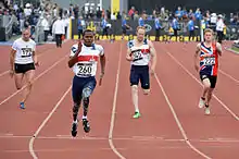 Four runners from Germany, the United Kingdom and the United States during a 100-metre qualifying heat at the 2014 Invictus Games