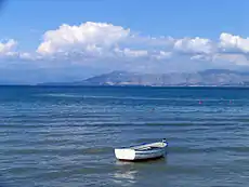 The Ionian Sea (Modern Greek: Ιόνιο Πέλαγος, romanized: Iónio Pélagos, IPA: [iˈoni.o ˈpelaɣos];[lower-alpha 1] Italian: Mar Ionio or Mar Jonio, IPA: [mar ˈjɔːnjo];[lower-alpha 2] Albanian: Deti Jon, IPA: [ˈdɛti ˈjɔn]) is an elongated bay of the Mediterranean Sea. It is connected to the Adriatic Sea to the north, and is bounded by Southern Italy, including Basilicata, Calabria, Sicily, and the Salento peninsula to the west, southern Albania (and western Apulia, Italy) to the north, and the west coast of Greece, including the Peloponnese.