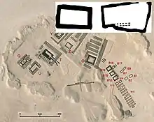Iry-Hor's tomb is the oldest tomb of the Abydos necropolis B in the Umm el-Qa'ab.[21] It comprises two separate underground chambers B1 (6 m × 3.5 m) and B2 (4.3 m × 2.45 m) excavated by Petrie in 1899 and later by Werner Kaiser.[2][22] A further chamber, now known as "B0", was uncovered during re-excavations of Iry-Hor's tomb in the 1990s.[19] These chambers have a size similar to those found in the tombs of Ka and Narmer. No superstructure, if there ever was one, survives to this day. Chamber B1 yielded jar fragments incised with his name.[21] Chamber B2 produced another incised jar fragment, a seal impression, several ink inscriptions and vessel fragments bearing the names of Ka and Narmer. Parts of a bed were also found onsite.[3]