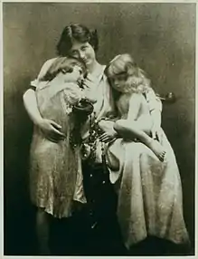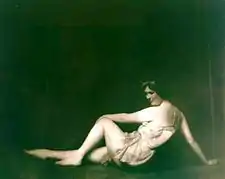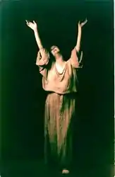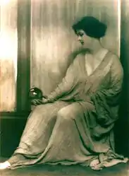 In 1910, Duncan met the occultist Aleister Crowley at a party, an episode recounted by Crowley in his Confessions.[19] He refers to Duncan as "Lavinia King", and used the same invented name for her in his 1929 novel Moonchild (written in 1917). Crowley wrote of Duncan that she "has this gift of gesture in a very high degree. Let the reader study her dancing, if possible in private than in public, and learn the superb 'unconsciousness' – which is magical consciousness – with which she suits the action to the melody."[20] Crowley was, in fact, more attracted to Duncan's bohemian companion Mary Dempsey (a.k.a. Mary D'Este or Desti), with whom he had an affair. Desti had come to Paris in 1901 where she soon met Duncan, and the two became inseparable. Desti, who also appeared in Moonchild (as "Lisa la Giuffria") and became a member of Crowley's occult order,[lower-alpha 2] later wrote a memoir of her experiences with Duncan.[21]
