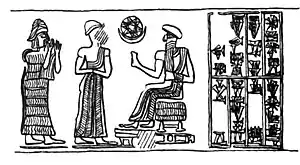 The tutelary deity of Isin, dating back to at least the Early Dynastic period, was the healing goddess Gula with a major temple (, E-gal-ma) sited there as well as smaller installations for the related gods of Ninisina and Sud.[2][3]