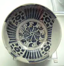 The so-called 'Golden Horn ware' was a variation on the blue-and-white decoration that was popular from the late 1520s to 1550s.[58] Golden Horn ware was so named because sherds in this style were excavated in the Golden Horn area of Istanbul.[lower-alpha 3] It was later realized that the pottery was made in İznik as some motifs on the vessels closely resembled those used on other blue-and-white Iznik pottery.[59] The decoration consists of a series of thin spirals adorned with small leaves. The narrow rims of dishes are painted with a meandering pattern. The design is similar to the illuminated spiral scrolls used as a background to Sultan Suleyman's Tuğra, or imperial monogram. Julian Raby has used the term 'Tuğrakeş spiral ware' as the tuğrakeş were the specialist calligraphers in the Ottoman court.[59] The earlier vessels were painted in cobalt blue while later vessels often include turquoise, olive-green and black.[60] A number of dishes dating from this period show the influence of Italian pottery. The small bowls and a large flat rims are similar in shape to maiolica tondino dishes that were popular in Italy between 1500 and 1530.
