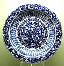 Although both the use of cobalt blue on a white background and the shape of large dishes were clearly influenced by Chinese porcelain from the Yuan and Ming dynasties, the early Iznik fritware dishes were far from being direct copies of Chinese designs. In some pieces, such as the front of a large charger with a foliate rim in the Çinili Koşk Museum in Istanbul, the decoration used only Ottoman Rumi designs.[49]