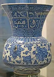 A key object from this period is a ceramic vessel in the form of a mosque lamp with an inscribed date that is now in the British Museum.[67] It is the best documented surviving piece of Iznik pottery and enables scholars to fix the dates and provenance of other objects. The lamp was discovered on the Temple Mount in Jerusalem in the middle of the 19th century and is believed to have been associated with the refurbishment of the Dome of the Rock initiated by Suleiman the Magnificent.[68][69] Around the base of the lamp are a series of inscribed cartouches giving the name of the decorator (Musli), a dedication to the İznik Sufi saint Eşrefzâde Rumi, and the date of AH 956 in the month of Jumada'l-Ula (AD 1549). The lamp is decorated in green, black and two shades of blue. The design includes pale blue cloud-banks, small-scale arabesques on a green ground and a row of tulip buds in dark-blue cartouches. The lamp can be used to date a group of other vessels including some large footed basins. Although the basins are quite different from the lamp in overall style, each basin shares motifs present on the lamp.[68][69][lower-alpha 4]