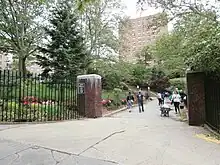 There are two comfort stations, or restrooms, within the park.[10][14] The comfort station adjoining the playground at 152nd Street is a single-story square structure with a hip roof, oriented 45 degrees from the surrounding streets. The brick facade contains large cylinders at each corner, with segmental arches between each cylinder.[14] The other comfort station, adjoining the playground at 149th Street, is a single-story rectangular structure with a gable roof. The brick structure was built prior to the WPA renovations.[16] Additionally, the southern boundary of the park contains a metal fence with brick piers capped with stone.[16]