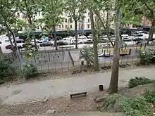 A curved concrete stair, which separates the dance floor terrace to the south and the promenade to the north, leads upward from 148th Street and Bradhurst Avenue to a landing at Edgecombe Avenue, just south of 150th Street. A path winds upward from the intersection of 150th Street and Bradhurst Avenue to the same landing. An additional path leads from 153rd Street at Bradhurst Avenue to Edgecombe Avenue's intersection with 155th Street and the 155th Street Viaduct.[17] The paths predate the WPA renovations in 1936. The WPA removed some of the original paths to make way for the recreational fields, while repaving these paths with hexagonal pavers. Some of the paths subsequently were repaved in asphalt.[16]