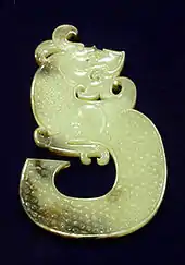 Both nephrite and jadeite were used from prehistoric periods for hardstone carving. Jadeite has about the same hardness (between 6.0 and 7.0 Mohs hardness) as quartz, while nephrite is slightly softer (6.0 to 6.5) and so can be worked with quartz or garnet sand, and polished with bamboo or even ground jade.[32] However nephrite is tougher and more resistant to breakage. Among the earliest known jade artifacts excavated from prehistoric sites are simple ornaments with bead, button, and tubular shapes.[33] Additionally, jade was used for adze heads, knives, and other weapons, which can be delicately shaped.