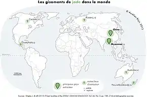 Nephrite can be found in a creamy white form (known in China as "mutton fat" jade) as well as in a variety of light green colours, whereas jadeite shows more colour variations, including blue, brown, red, black, dark green, lavender and white.[35] Of the two, jadeite is rarer, documented in fewer than 12 places worldwide. Translucent emerald-green jadeite is the most prized variety, both historically and today. As "quetzal" jade, bright green jadeite from Guatemala was treasured by Mesoamerican cultures, and as "kingfisher" jade, vivid green rocks from Burma became the preferred stone of post-1800 Chinese imperial scholars and rulers. Burma (Myanmar) and Guatemala are the principal sources of modern gem jadeite. In the area of Mogaung in the Myitkyina District of Upper Burma, jadeite formed a layer in the dark-green serpentine, and has been quarried and exported for well over a hundred years.[16] Canada provides the major share of modern lapidary nephrite.