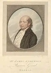 James Anderson (17 January 17386 August 1809[1]) was a Scottish physician and botanist who worked in India as an employee of the East India Company. During his career in India, he was involved in establishing a botanical garden at Mambalam, Madras, originating from a nopalry or Opuntia garden where he made attempts to introduce the cultivation of cochineal insects. He then attempted to introduce various other economically valuable plants, and examined silk and lac production. He maintained a steady communication with his friend from youth, James Anderson LLD (1739–1808) who published some of his notes in The Bee, or Literary Weekly Intelligencer, which has led to the use of the distinguishing form James Anderson MD or James Anderson of Madras.