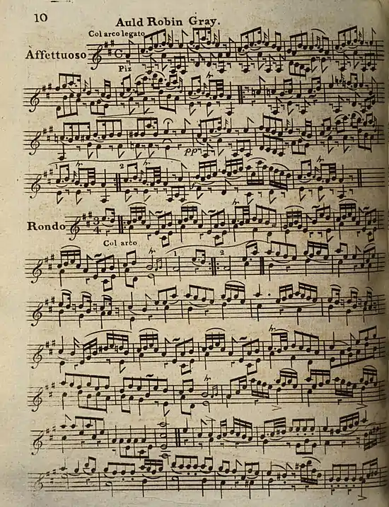 Affetuoso, based on the Scots ballad Auld Robin Gray, and beginning of the Rondo, from Duett II in Two Duetts for One Performer on the Violin, op.4 by James Brooks (page 10). The virtuoso writing includes, among other things, left-hand pizzicati, and a partial descending scale of 10ths.