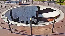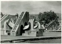 A Jantar Mantar (Hindustani pronunciation: [d͡ʒən̪t̪ər mən̪t̪ər]) is an assembly of stone-built astronomical instruments, designed to be used with the naked eye. There were five Jantar Mantars in India. All were built at the command of the Rajah Jai Singh II, who had a keen interest in mathematics, architecture and astronomy. The largest example is the equinoctial sundial belonging to Jaipur's assembly of instruments, consisting of a gigantic triangular gnomon with the hypotenuse parallel to the Earth's axis. On either side of the gnomon is a quadrant of a circle, parallel to the plane of the equator. The instrument can be used with an accuracy of about 20 seconds by a skilled observer to determine the time of day, and the declination of the Sun and the other heavenly bodies. It is the world's largest stone sundial, and is known as the Samrat Yantra.[1][2] The Jaipur Jantar Mantar is a UNESCO World Heritage Site.[3]