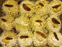 Jaynagarer Moa (Bengali: জয়নগরের মোয়া) is a seasonal Bengali sweetmeat delicacy prepared from date palm jaggery and Kanakchur khoi. This variety of Moa originated in Jaynagar Majilpur of the South 24 Parganas district in the Indian state of West Bengal. It is now a popular sweet, being produced in Kolkata and elsewhere, sometimes with cheaper ingredients and chemical flavours.[1] Jaynagarer Moa was given a Geographical Indication tag in 2015[2] [3] which will enable the product to be protected from unauthorized uses and piracy.[4]