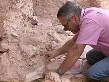 Jean-Jacques Hublin at Jebel Irhoud (Morocco), pointing to the crushed human skull (Irhoud 10), whose orbits are visible just beyond his finger tip