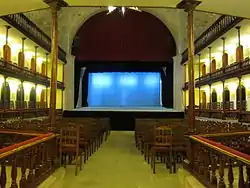 Behind the Sanctuary of Nuestra Señora de la Soledad is Jardín (garden) Hidalgo, which faces the Hinojosa Theater. The theater, built in Moorish style with arches, windows, and railings grouped in threes and fives, was constructed between 1876 and 1890 through the efforts of local politician José María Hinojosa. The stage is set beneath a sandstone arch, and the seats are finely carved from wood. Throughout most of its history, lighting was provided by carbide lamps, and a large mirror from that era still remains. It is believed that the building served as a barracks during the Mexican Revolution. Today, it is utilized for live performances, but in the past, it served various functions, including being a movie theater, a venue for social events, a library, and a public school. Adjacent to the building is the Community Museum, which features an array of items such as carpentry tools, archaeological pieces, sewing machines, and more from the area's rich history."[1][2]
