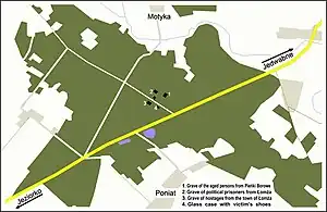 Woodland cemetery in Jeziorko village in the Northeastern part of Poland is located approximately 7 kilometers (4.3 mi) from the town of Łomża along Route 668. The remains of victims murdered by the Nazi troops rest in the cemetery which is among very few with almost completely documented history of events that happened during the Nazi occupation.