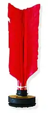 The official shuttlecock consists of four equal-length goose or duck feathers joined at a rubber or plastic base. It weighs approximately 15–25 grams (0.53–0.88 oz) and is 15–21 centimetres (5.9–8.3 in) long. The feathers vary in color, usually dyed red, yellow, blue, or green. In competitions a pink shuttlecock is preferred.