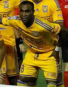 On July 13, 2014, it was confirmed that Guerrón would be joining Liga MX side Tigres UANL.[6][7] On July 26, Guerrón made his official debut with Tigres, coming on as a 63rd-minute substitute for Édgar Lugo on the 4–2 victory of Tigres over Club León at the Estadio Universitario in the second match of the team in the Apertura 2014 tournament. He scored his first goal via penalty-kick in an Apertura 2014 Copa MX game against Estudiantes de Altamira in the victory of 4–0 at the Estadio Universitario on July 29. On August 16, Guerrón scored his first goal in a League game, on the 1–1 draw against Puebla FC, at the Estadio Cuauhtémoc. On September 27, he scored the second goal for the 3–2 victory against C.F. Pachuca at the Estadio Hidalgo, with a powerful shot from outside the penalty area. On October 25, he scored a goal in the Clásico Regiomontano against C.F. Monterrey, for a 2–2 draw at the Estadio Tecnológico. On November 22, he scored the first goal of the 2–1 victory against Club Toluca at the Estadio Universitario. In the "liguilla" (play-offs), he scored the goal of the 1–1 draw against Pachuca in the away game at the Estadio Hidalgo on November 26. In the home game of the finals against Club América on December 11, 2014, Guerrón scored the goal of the 1–0 victory. On February 7, 2015, he scored the goal of the 1–0 home win over Puebla FC. He scored one goal in the 3–0 home victory against Pumas UNAM on February 28. On March 14, Guerrón scored the second goal of the 2–1 home victory against Pachuca FC. On April 4, he scored the third goal of the 3–1 home victory over Tiburones Rojos de Veracruz. He scored the second goal for the 3–1 victory over Querétaro FC at the Estadio Corregidora on April 24. On May 13, he scored the goal of the 1–1 against Santos Laguna in the quarterfinals of the play-offs. Tigres became champion of the Apertura 2015 season, but Guerrón, playing as the substitute of Jürgen Damm, scored only two goals in the season and played only one game of playoffs.