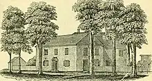 On November 16, 1777, British General Lord Cornwallis crossed the Delaware River from Chester, Pennsylvania,[12] and captured Fort Billingsport.[13] After marching into Woodsbury, Cornwallis commandeered John Cooper's house, because it was "the finest and best equipped home in the section",[2] and used it as his temporary headquarters for three days,[14][15] from November 21 to 24, 1777.[16] Cooper locked his closets before fleeing to the home of his sister Ann Whitall, who lived in a farmhouse at Red Bank, on the Delaware River.[7][2] The third floor of the house was used as a makeshift hospital for the British occupiers,[6] who left bayonet marks on the doors and wood panels, possibly looking for silver and other valuables.[7] While Cornwallis and his officers stayed at the Cooper House, the British troops camped on the grounds of the Woodbury Friends' Meetinghouse.[13]