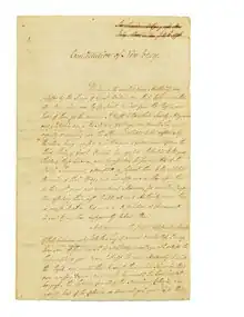 Cooper served on the committee that drafted New Jersey's first constitution, and was likely its principal author.[1] For many years, historians believed that Jonathan Dickinson Sergeant was the main author of the New Jersey constitution, as claimed in a 1929 book by Charles R. Erdman Jr.[1] However, Irwin N. Gertzog's discovery of "The First Draught of the Constitution of New Jersey", a manuscript in John Cooper's handwriting, has given credence to the view that Cooper was the lead author, at least initially.[1][10] The puzzle of who the "true" author was may never be confirmed with complete certainty.[10]