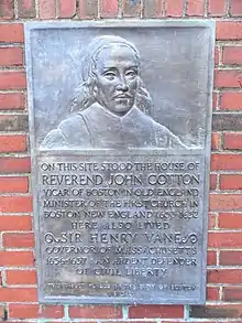 Plaque near the John Adams Courthouse in Boston, Massachusetts marking the site of Cotton's house