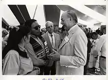 Smithsonian Secretary Robert McCormick Adams and John Gonzales, discuss the National Museum of the American Indian at a reception held at the Wheelwright Museum of the American Indian in Santa Fe, New Mexico, in August 1990.