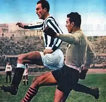 In 1950, Hansen and Præst were joined by another Dane, captain of the 1948 Olympic team Karl Aage Hansen, who came from Serie A league rivals Atalanta Bergamo.[3] The great level of understanding of those three great Danes made John Hansen feel as if he could play with his eyes closed, showing all of his skills. Not the kind of player to be present at every moment during a game, he was a very prolific goal scorer. Though he was not fast by Serie A standard,[13] he was smart at the moment of getting unmarked and losing his defender, and had an incredible feeling for being at the right spot on the right moment. During the 1951–52 Serie A season, Hansen scored 30 goals, earning him the "Capocannoniere" Italian top goal-scorer title, as he won his second Serie A championship with Juventus. He spent six seasons at Juventus where he scored 124 goals in 187 games in the Serie A.[3]