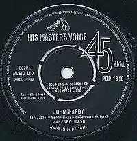 The earliest known recordings are credited to Eva Davis for Columbia in 1924, Ernest Stoneman for Okeh in 1925, and Buell Kazee for Brunswick in 1927.[3] As with many other traditional folk songs, lyrics change from version to version. Early folk historians confused the ballads of John Hardy and John Henry. This has led to a mixing of stories related to Hardy and Henry. In fact, the historical John Henry was a steel driver, not a railroad worker. John Harrington Cox, in an early (1919) article in The Journal of American Folklore attempts to disentangle the history of the two songs and their main characters, and provides a detailed discussion of five versions of "John Hardy."[4]