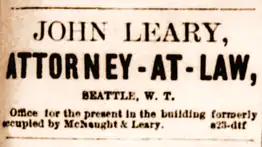 Leary was admitted to the bar in 1871, becoming a "pioneer lawyer" in Washington Territory.[22][32] That same year, he became a junior partner in McNaught & Leary law firm.[33][23] In 1872, McNaught & Leary was one of five law firms in Seattle[34] and one of the six most active law firms in Washington Territory.[35] One of Leary's most consistent occupations in Seattle was law; he was active in this area for eleven years.[22][36]