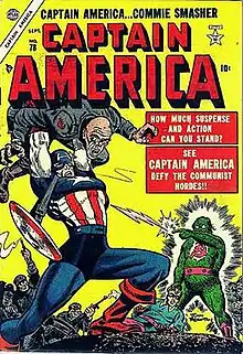 Romita went on to draw a wide variety of horror comics, war comics, romance comics and other genres for Atlas. His most prominent work for the company was the short-lived 1950s revival of Timely's hit character Captain America, in Young Men #24–28 (December 1953 – July 1954) and Captain America #76–78 (May–September 1954).[21] Romita had been offered the Captain America work by Lee after Mort Lawrence's art was deemed unsatisfactory.[22] The character was billed now as "Captain America, Commie Smasher" in the wake of the Cold War and faced enemies associated with the Soviet Union.[23] The series was a commercial failure, and was cancelled after just three issues.[24] Romita attributed the series' failure to the changing political climate, particularly the public opposition to the Korean War; the character subsequently fell out of active publication for nearly a decade.[25]