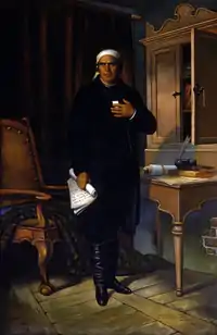 Morelos had ambitions for something more than working with his hands, and assiduously studied; his maternal grandfather was a school teacher.[8] In 1789, he enrolled in the Colegio de San Nicolás Obispo in Valladolid, where Father Miguel Hidalgo y Costilla was rector.[8] When he was ordained a priest, he, as with many others without connections, had no benefice to guarantee any income as a priest.[8] However, as a secular cleric, he took no vow of poverty and could freely pursue business activities to make a living.[8]