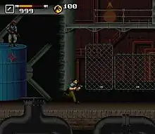 Additionally, the game features stages in which Grant must flee a Tyrannosaurus rex.[4][8] Obstacles such as fire and spikes must also be avoided.[4][8] First-aid kits can be collected to replenish the player's health, while identification cards can be collected for bonus points.[8]